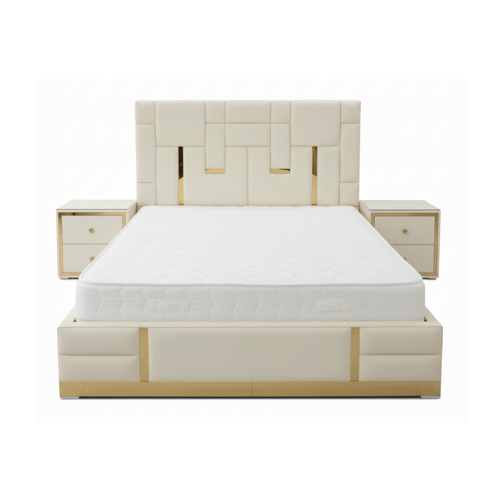 Indulge in opulent comfort with the Elegant Brass-Look King Size Upholstery Bed with Two Side Tables by The Furniture Idea—a masterful blend of modern sophistication and timeless allure. Handcrafted from premium, eco-friendly wood with a luxurious brass-look finish, this king-size set (L72″ x H54″ x W78″) delivers spacious relaxation and enduring style for master bedrooms or grand spaces.